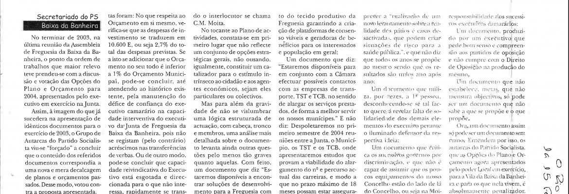 No terminar de 2003, na última reunião da Assembleia. de Freguesia da Baixa da Banheira, o ponto da ordem de trabalhos que maior relevo teve prendeu-se com a discussão e votação das Opções do Plano e Orçamento para. 2004, apresentados pelo executivo em exercício na Junta. Assim, à imagem do que já sucedera na apresentação de idênticos documentos para o exercício de 2003, o Grupo de Autarcas do Partido Socialista viu-se “forçado” a concluir que o conteúdo dos referidos documentos correspondia a uma nova e mera decalcagem de planos e orçamentos passados. Desse modo, votou contra a proposta apresentada. Alguns dos aspectos sobre os quais incidiu especialmente a posição dos Socialistas foram: No que respeita ao Orçamento em si mesmo, verifica-se que as despesas de investimento se traduzem em 10.600 €, ou seja 2,7% do total das despesas previstas. Se a isto se adicionar que o Orçamento no seu todo é inferior a 1% do Orçamento Municipal, pode-se concluir, até atendendo ao histórico existente, pela manutenção do défice de confiança do executivo camarário na capacidade interventiva do executivo da junta de Freguesia da Baixa da Banheira, pois não se registam (pelo contrário) acréscimos nas transferências de verbas. Ou de outro modo, pode-se concluir que capacidade reivindicativa do Executivo está esgotada e direccionada para o que não interessa, rapidamente se transformando em submissão, silêncio cúmplice ou até incapacidade de persuasão quando o interlocutor se chama C.M. Moita. No tocante ao Plano de actividades, constata-se em primeiro lugar que não reflecte um conjunto de opções estratégicas gerais, não ousando, igualmente, constituir um catalizador para o estímulo intrínseco ao cidadão e aos agentes económicos, sejam eles particulares ou colectivos. Mas para além da gravidade de não se vislumbrar uma lógica estruturada de actuação, com cabeça, tronco e membros, uma análise mais detalhada sobre o documento levanta ainda outras questões pelo menos tão graves quanto aquelas. Com feito, um documento que diz “Estaremos disponíveis a encontrar soluções de desenvolvimento para a Freguesia com o Comércio Local e Serviços” e não diz, Promoveremos encontros trimestrais (p.e.) junto do tecido produtivo da Freguesia garantindo a criação de plataformas de consenso viáveis e geradoras de benefícios para os interessados e população em geral; Um documento que diz: “Estaremos disponíveis para em conjunto com a Câmara efectuar possíveis contactos com as empresas de transporte, TST e TCB, no sentido de alargar os serviços presta-dos, de forma a melhor servir os nossos munícipes.” E não diz: Despoletaremos no primeiro semestre de 2004 reuniões entre a Junta, o Município, os TST e os TCB, onde apresentaremos estudos que provam a viabilidade do alargamento do nº e percurso actual das carreiras, e modo a que no prazo máximo de 18 meses possam estar assegurados melhores meios de trans-porte à nossa população. Um documento que diz prever a “realização de um novo levantamento sobre a realidade dos pátios e casas desactivadas que podem criar situações de risco para a saúde pública.” e que não diz que todos os anos se propõe ao mesmo sendo que os resultados são nulos ano após ano;