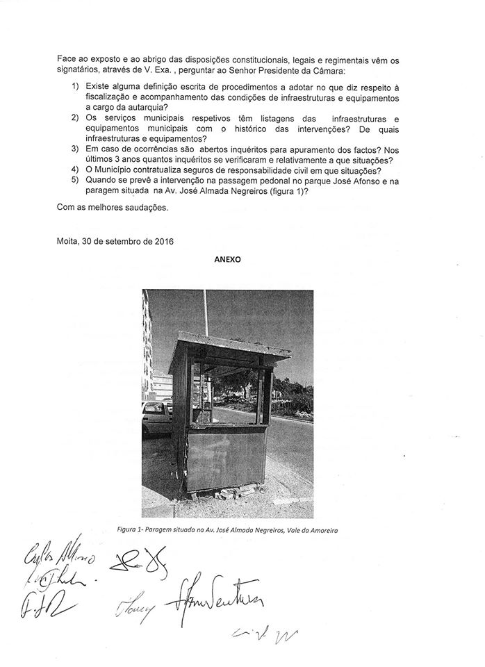 A bancada do Partido Socialista, colocou questões na ultima Assembleia Municipal de dia 30 de setembro de 2016 ao executivo (PCP/CDU) a respeito das condições de segurança de infraestruturas e equipamentos no Concelho da Moita.