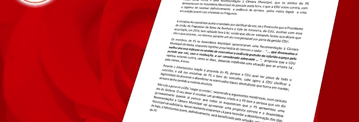 Reage desta forma a uma Recomendação à Câmara Municipal, que os eleitos do PS apresentaram na Assembleia Municipal da passada sexta feira, e que a CDU votou contra, com o objetivo de resolver definitivamente a cedência de terreno pelos meios legais a uma associação juvenil com atividade na Freguesia.