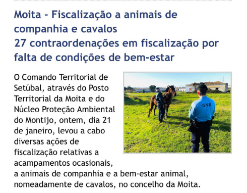 Com vista a dar resposta eficaz a este problema, “o Posto Territorial da Moita e o Núcleo de Proteção Ambiental do Montijo, no passado dia 21 de janeiro, levaram a cabo diversas operações relativas a acampamentos ocasionais, animais de companhia e a bem-estar animal, nomeadamente de cavalos no concelho da Moita. Foram fiscalizados 11 cães, 9 cavalos e 9 proprietários identificados”, como relata o jornal Rostos.