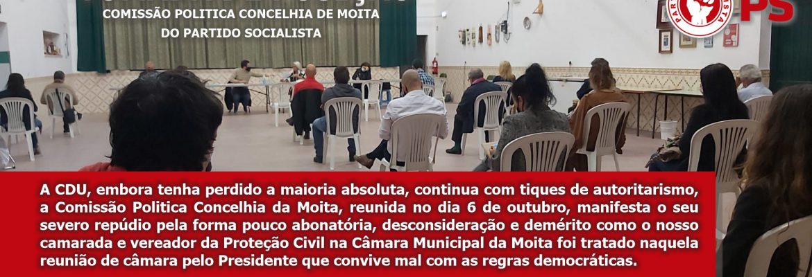 Pelo exposto, considerando a forma exemplar e preocupada com a segurança do município, para além da entrega com que  o camarada Luís Chula tem exercido as suas competências, num quadro de especial complexidade, gerindo funcionalmente e politicamente de forma equilibrada e urbana, acrescidas às dificuldades inerentes a quem está em representação do PS numa câmara em que a CDU, embora tenha perdido a maioria absoluta, continua com tiques de autoritarismo, a Comissão Politica Concelhia da Moita, reunida no dia 6 de outubro, manifesta o seu severo repúdio pela forma pouco abonatória, desconsideração e demérito como o nosso camarada e vereador da Proteção Civil na Câmara Municipal da Moita foi tratado naquela reunião de câmara pelo Presidente que convive mal com as regras democráticas.